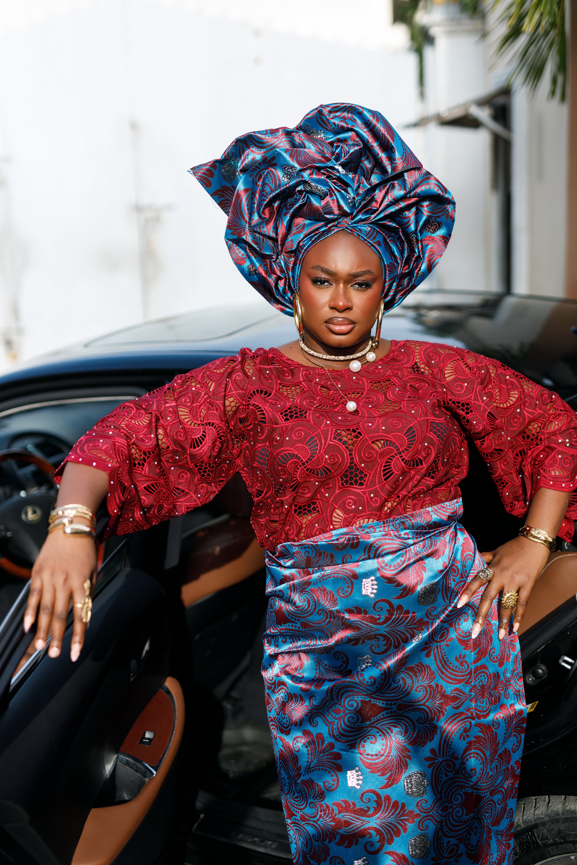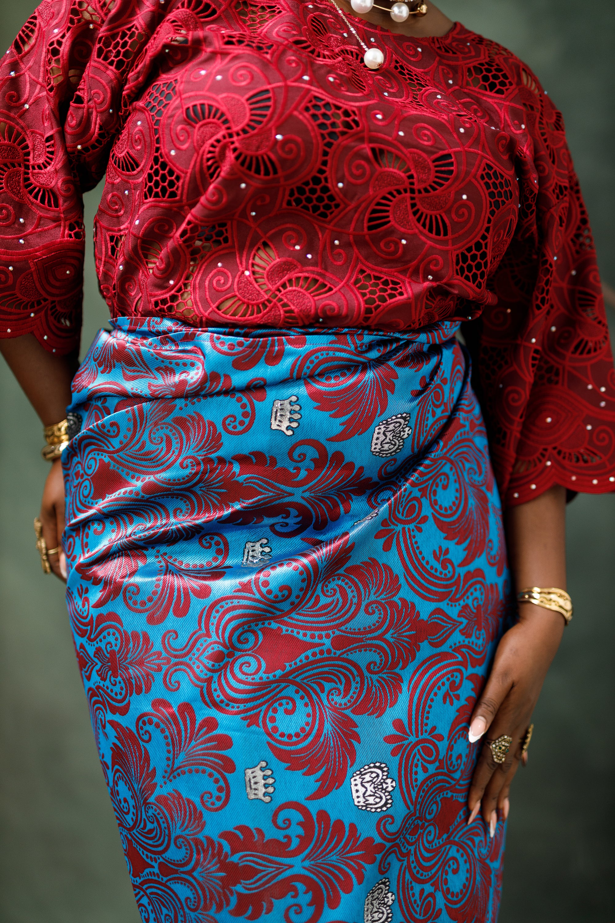 Vintage Style Chord lace Buba (Blouse) and matching midi length Damask wrapper. Style together for a chic and nostalgic look.