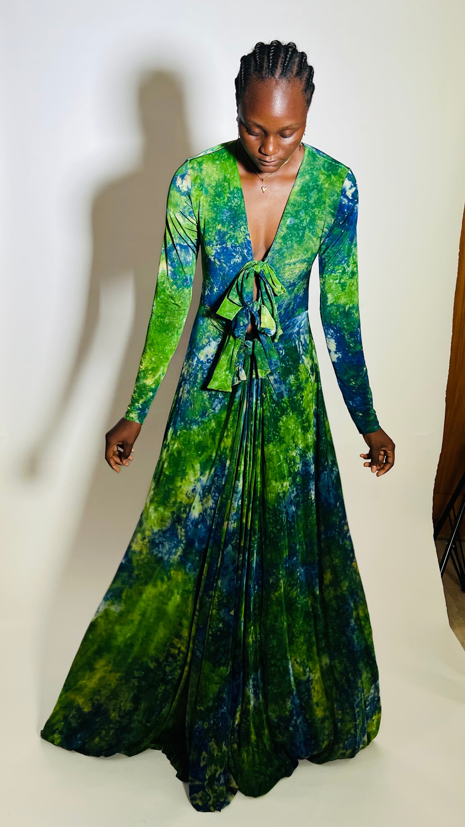 Our Tie Dye Maxi Dress features tie details at the bust, made with stretchy silky lycra fabric, it hugs and flatters every body type.