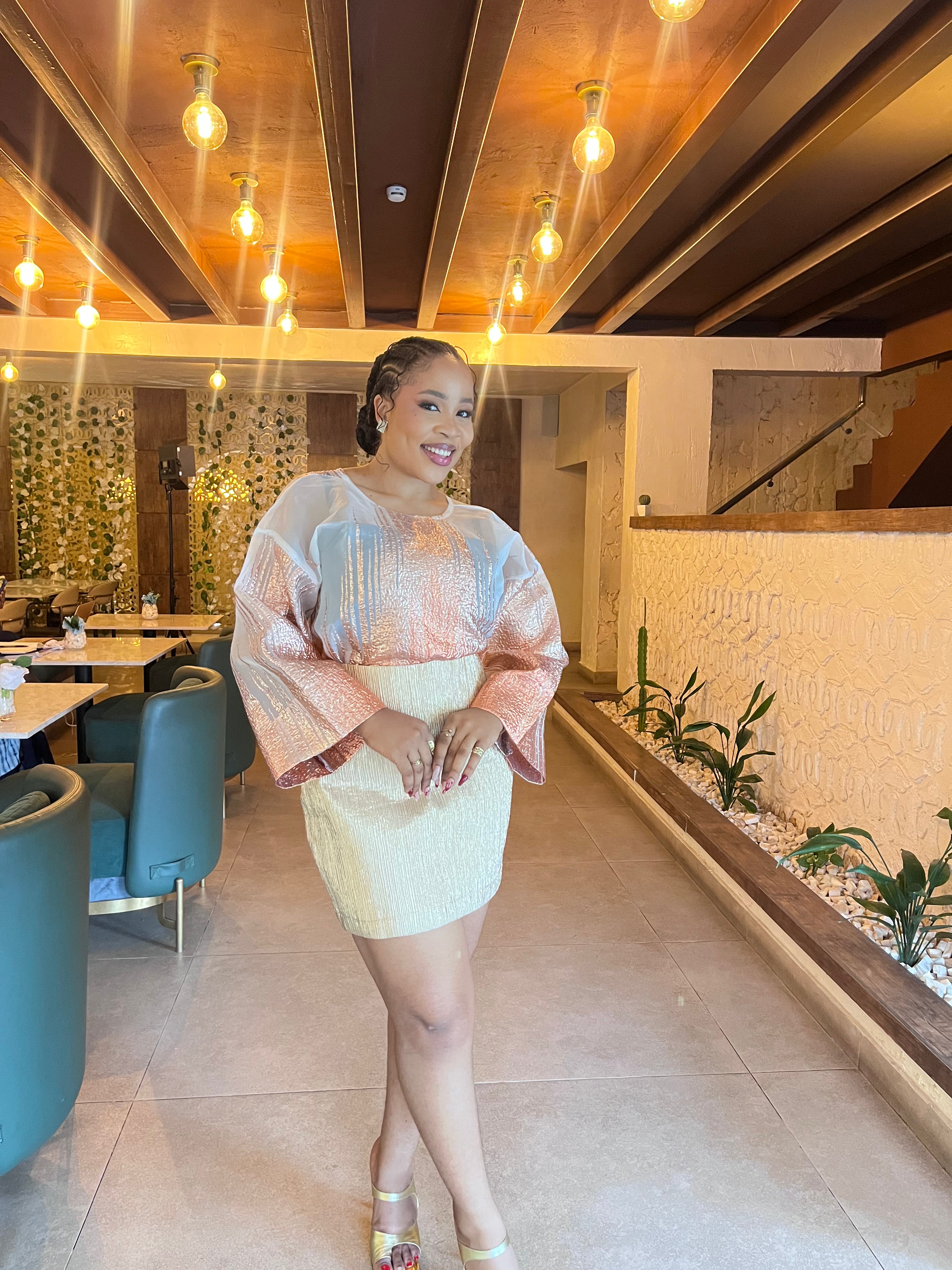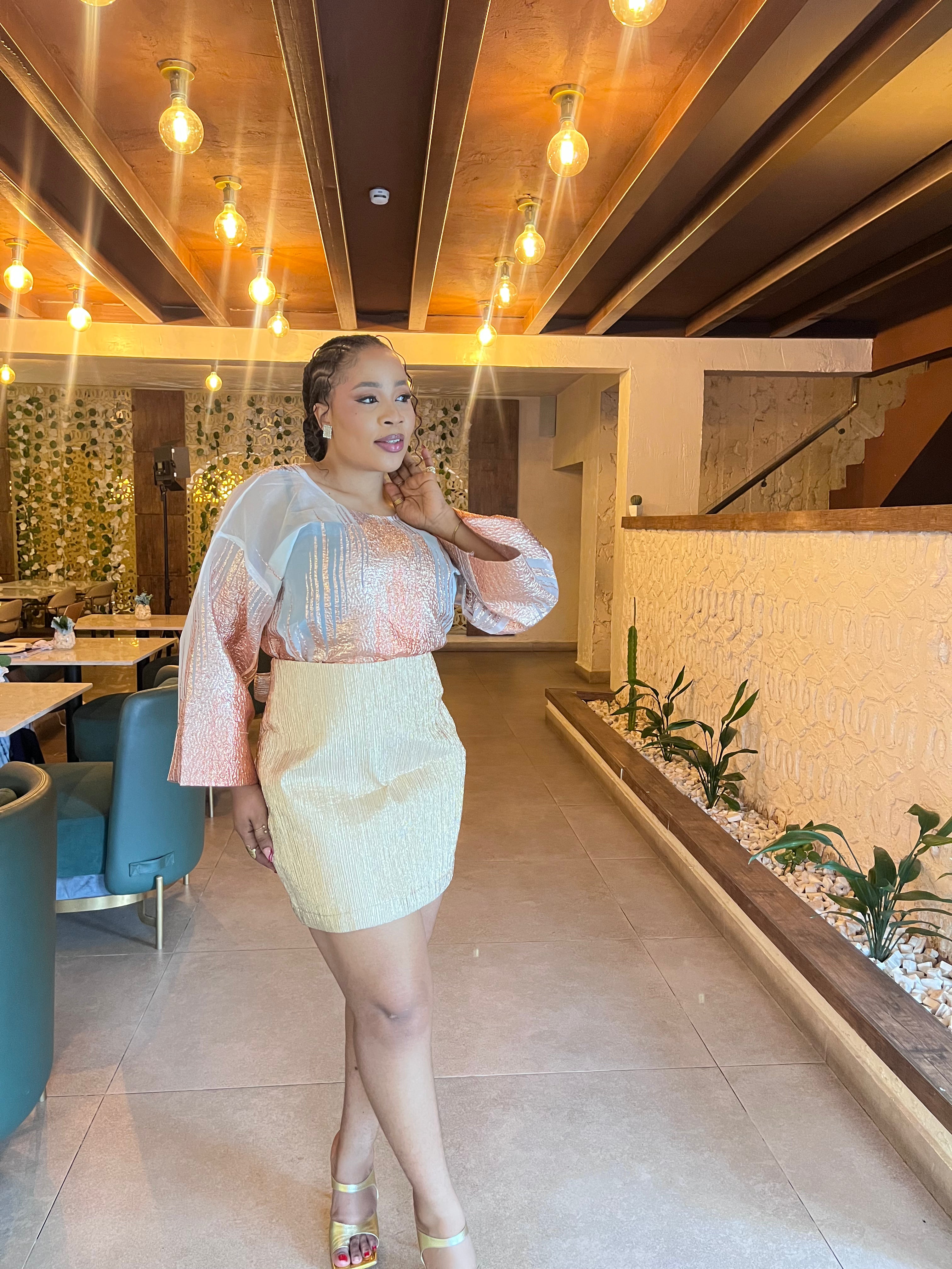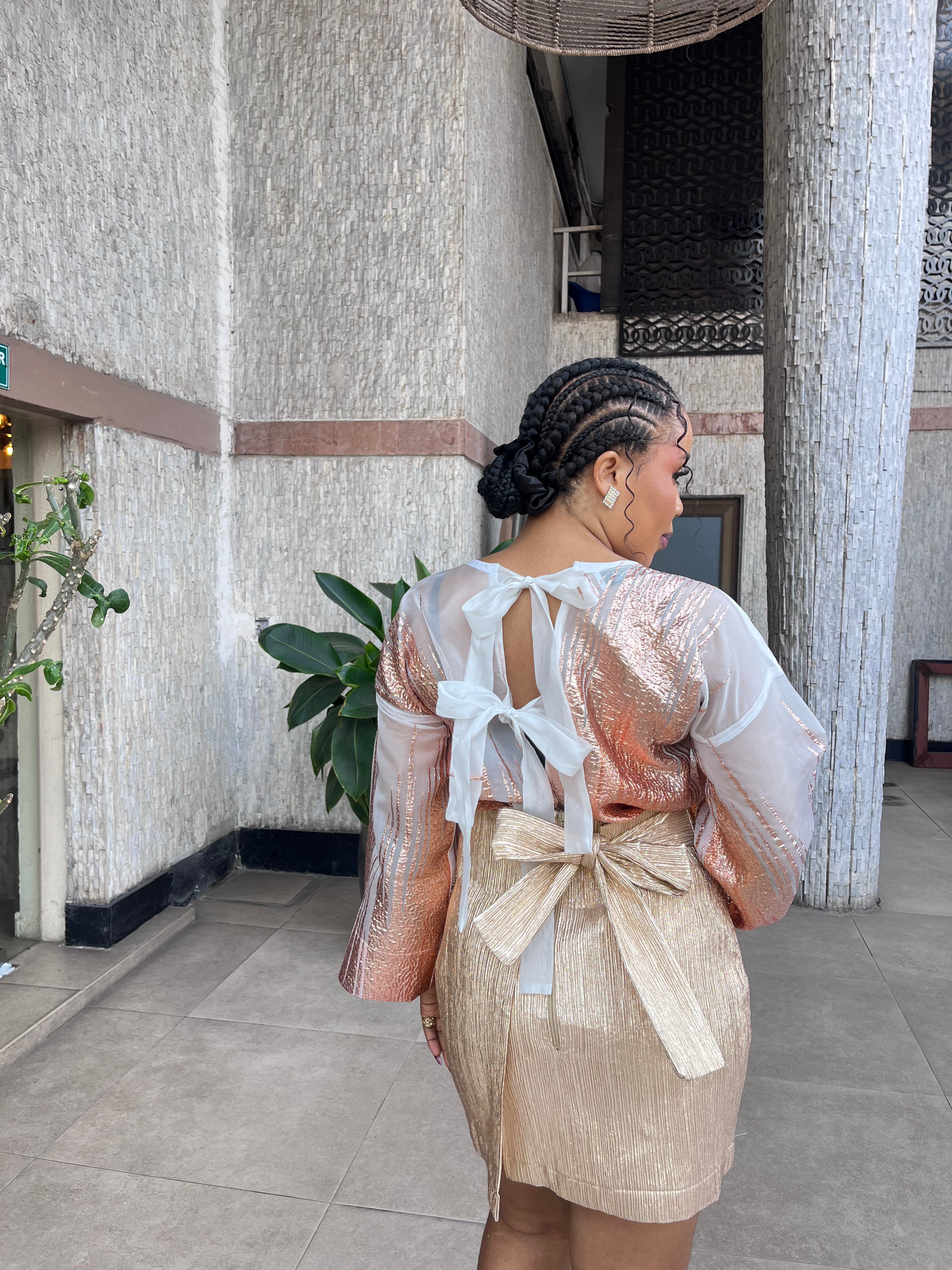 Vintage Style Brocade Organza Buba (Blouse) with ties at the back and matching mini brocade skirt wrapper. Style together for a chic and nostalgic look.