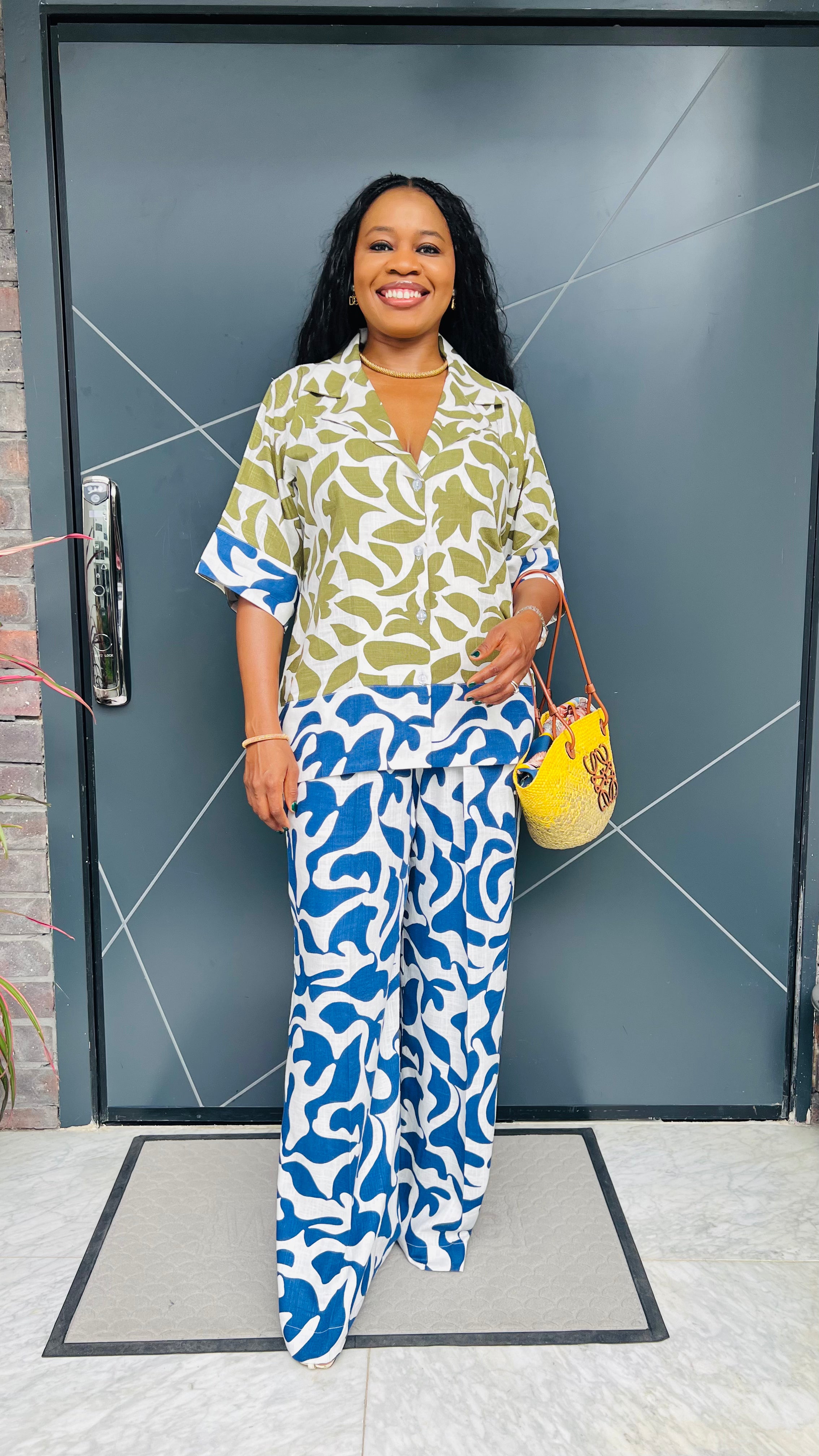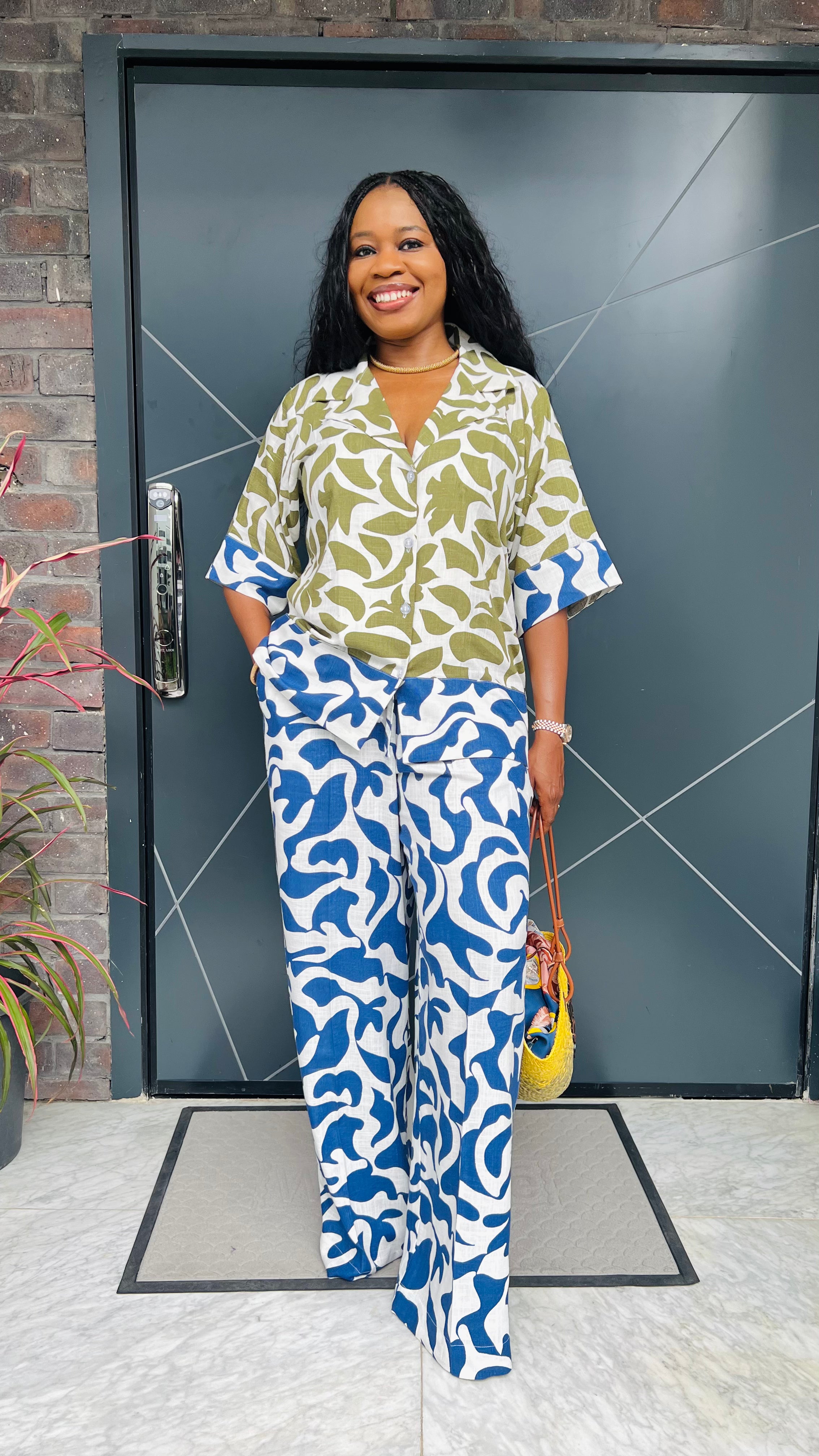 Mixed Print Linen Shirt and Pant Set.
