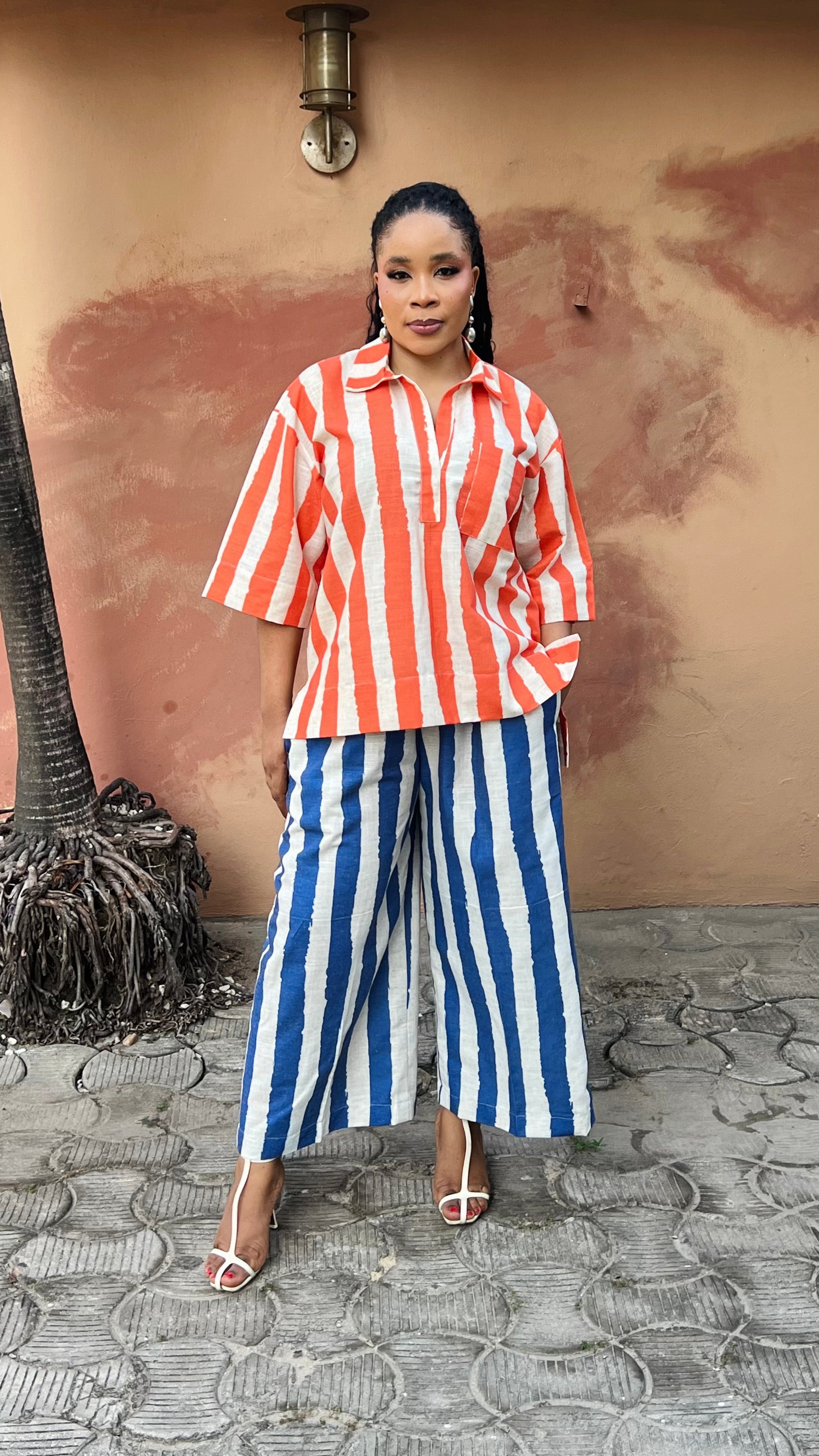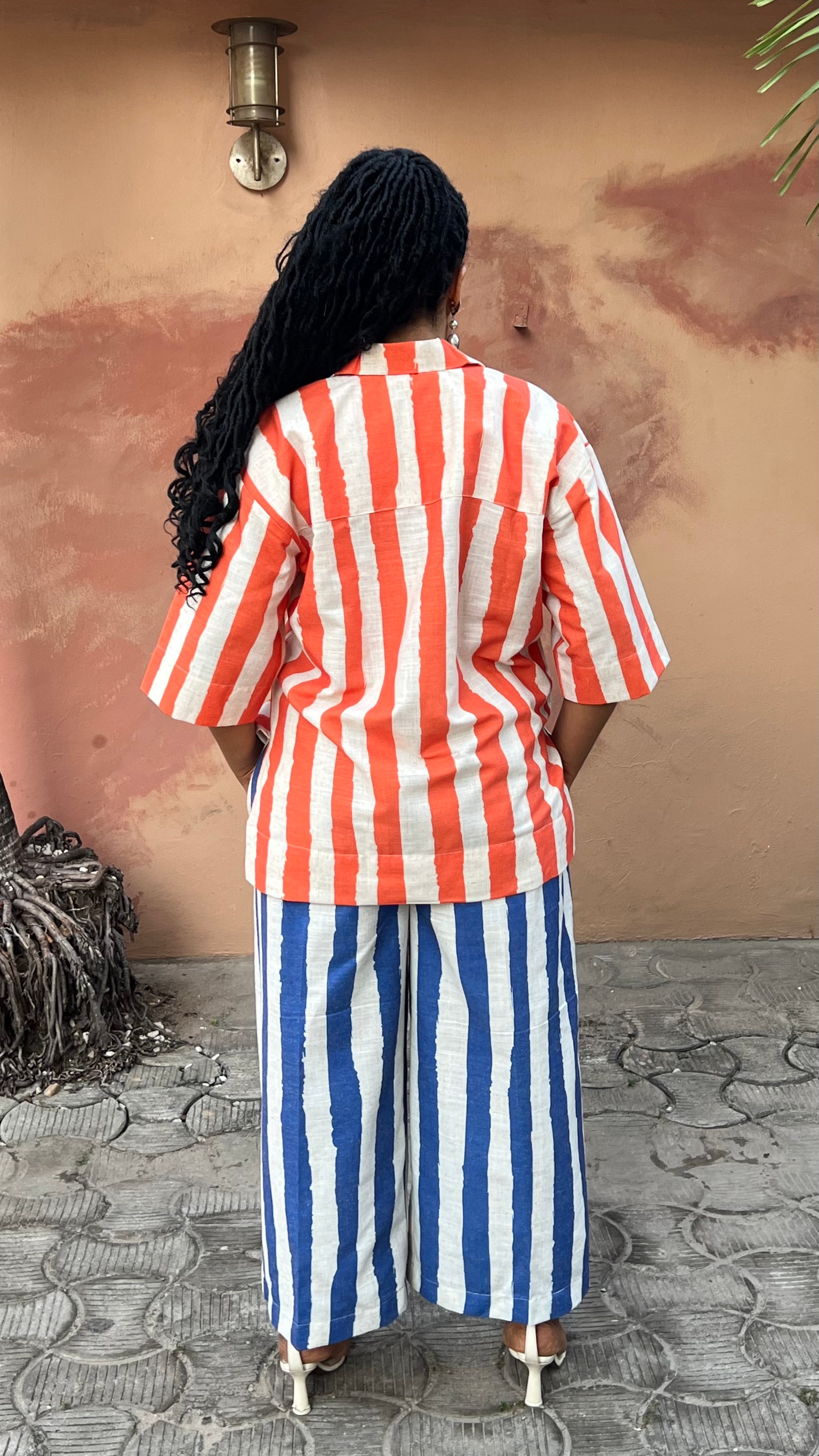 Mixed striped linen shirt and culottes set.