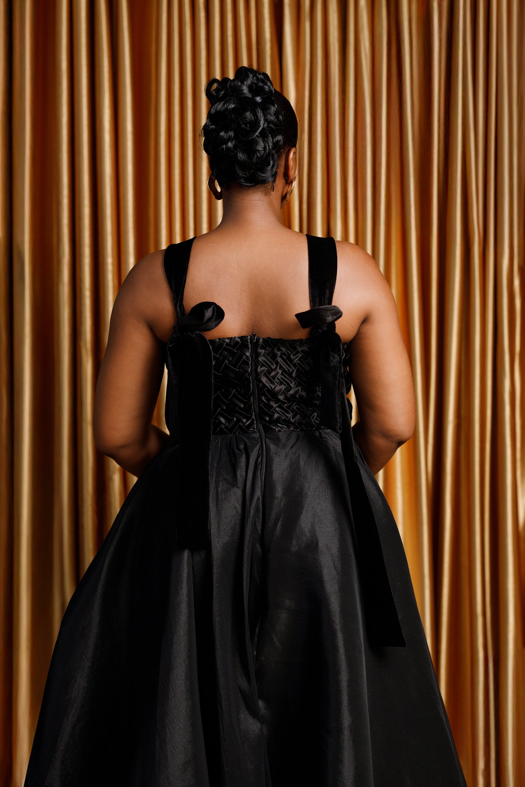 This perfect little black bubble dress features a woven satin bust detail, velvet straps and a silk taffeta bubble puff to finish off the look.