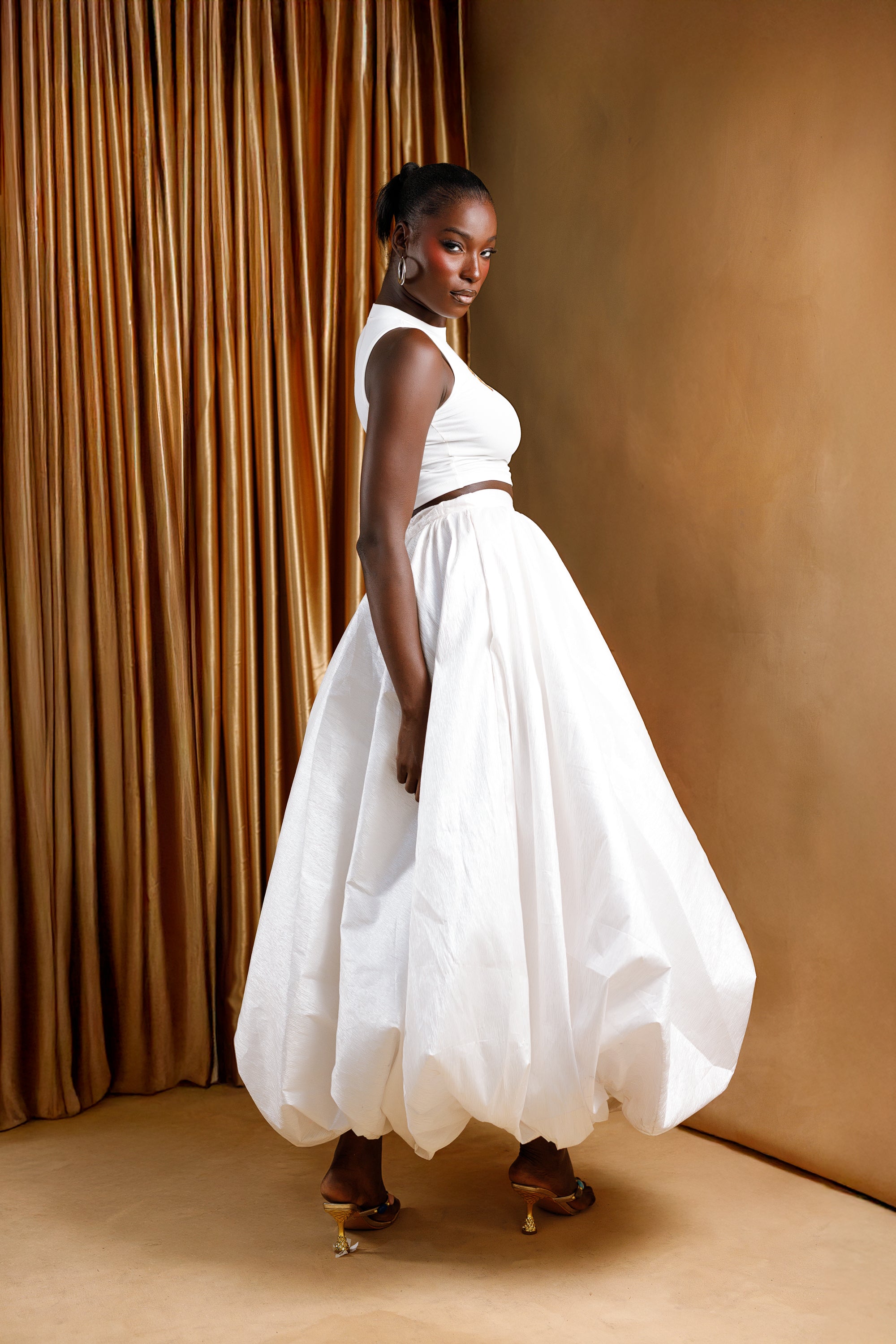 This statement bubble skirt features side pockets and is made with a slightly structured taffeta fabric.
